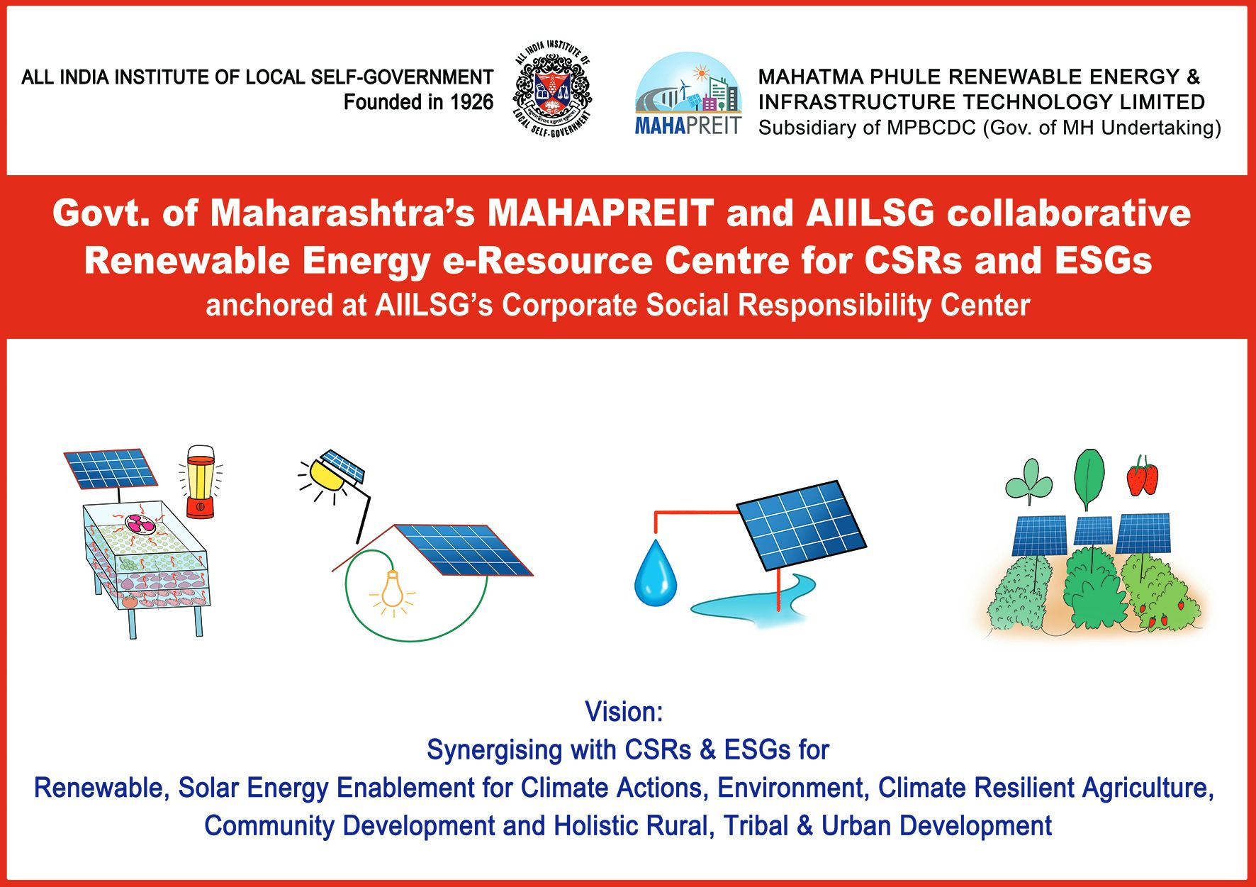 - MAHAPREIT [Mahatma Phule Renewable Energy and Infrastructure Technology Limited] and AIILSG [All India Institute of Local Self-Government] together launched their collaborative initiatives of Sahastra Gram Surya Darshan Program and Renewable Energy E-Resource Centre for CSRs & ESGs on 27th November 2025 at MAHAPREIT, Mumbai. The programs were launched at the hands of Mr. Bipin Shrimali, Managing Director, MAHAPREIT and Prof. Dr. Mukesh Kanaskar, Deputy Director General, AIILSG in the presence of august gathering of dignitaries from the sector.